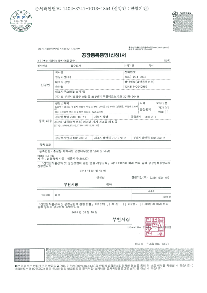 공장등록증 페이지 정보 작성자 관리자 댓글 0건 조회 621회 작성일 19-09-29 16:48 본문 공장등록증 목록 이전글사업자등록증-한창기전 20.03.17 다음글기업부설연구소 인증서 19.09.29